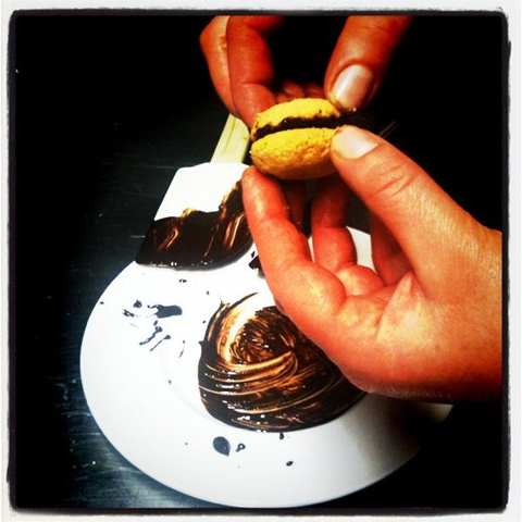 While the cookies bake to melt the chocolate in a double boiler (or put a pan with a little of water on the fire, into this in the pan with the chocolate and very little water).