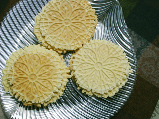 Pour a tablespoon or so of batter in a cangelle [pizzelle] iron for two or three minutes.
