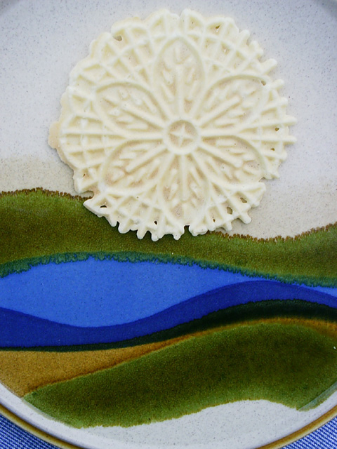 Notes Mrs. Anna-Maria Benvenuto has collected hundreds of recipes from relatives, friends and neighbors over the years. She recorded the recipes in Italian in numerous notebooks, often naming the recipe after the person who gave it to her (The one in this entry was provided to her by Nadine)...... The following notes were taken from (English) WIKIPEDIA, the free encyclopedia: Pizzelle Origin Place of origin Italy, Region or state,Abruzzo Course Dessert Main ingredient(s) Flour, butter/oil, and sugar Pizzelle (pronounced with ts sound, like "pizza") (singular pizzella) are traditional Italian waffle cookies made from flour, eggs, sugar, butter or vegetable oil, and flavoring (often vanilla, anise, or lemon zest). Pizzelle can be hard and crisp or soft and chewy depending on the ingredients and method of preparation.Pizzelle were originally made in the Abruzzo region of south-central Italy. The name comes from the Italian word for "round" and "flat" (pizze); this is also the meaning of the word pizza. Many other cultures have developed a pizzelle-type cookie as part of their culture (for example, the Norwegian Krumkake). It is known to be one of the oldest cookies, and is believed to have developed from the ancient Roman crustulum. Pizzelle are known as ferratelle in the Lazio region of Italy. In Molise they may be called ferratelle, cancelle, or pizzelle. The cookie dough or batter is put into a pizzelle iron, which resembles a waffle iron. The pizzelle iron is held by hand over a hot burner on the stovetop, although some models are electric and require no stove. Typically, the iron stamps a snowflake pattern onto both sides of the thin golden-brown cookie, which has a crisp texture once it is cooled. There are also several brands of ready-made pizzelle available in stores. Pizzelle shaped into a cannolo and filled with an orange-almond creme. Pizzelle are popular during Christmas and Easter. They are often found at Italian weddings, alongside other traditional pastries such as cannoli and traditional Italian cookies. It's also common for two pizzelle to be sandwiched with cannoli cream (ricotta blended with sugar) or hazelnut spread. Pizzelle, while still warm, can also be rolled using a wooden dowel to create cannoli shells......................... From Italian Wikipedia, google machine translation: Ferratella From Wikipedia, the free encyclopedia. Pizzella (or Ferratella or Neola) Category: products and fresh pasta, bread, biscuits, pastry and confectionery Production area: the whole region and particularly the province of Chieti Region: Abruzzo Notes: The Ferratella or deletes or Pizzella is a typical sweet Abruzzi created by biscuit dough baked with a double red-hot plate on the fire, which narrowed the dough above and below, gives the cake the shape of the wafer covered by ribs. Among the different variants of design, plot a turbot, or gate, giving rise to the name Ferratella. Preferably rectangular, but the feast of St Valentine are also prepared in the shape of a heart. In some provinces of Abruzzo is also called cloud or Neola. In some cases this is sweet roll like a cannolo stuffed with jam, grape traditionally, but also with pastry cream or chocolate. The variant with two overlapping filled wafers is called coperchiola, the coverage of the first wafer with the second, the lid. Is prepared mostly in winter, at Easter and during the patronal feasts, plays a central role in palmentieri, prepared special gift in honor of the patron saint. The plate used for baking this cake, called "lu Ferre ', was brought in dowry from the woman, in fact, in the central bore engraved initials of the future bride Ferratella (or Pizzella or Registry) Traditional public sector (in accordance with art. 8 D. Lgs. 30 April 1998, No 173) Category: Fresh pasta and bakery products, biscuits, pastry and confectionery Production area: Whole region Region: Molise Notes: In the Molise Ferratella are also called Registry. Are traced to a cake of the ancient Romans said Crustulum. They too, like Ferratella Abruzzo, are produced using a mold made of steel or cast iron, which gives its shape to desserts, often with cross groove reminiscent certain gates, hence the name. Until the'60s were served to the wedding................... Da Wikipedia, l'enciclopedia libera. PIZZELLE (o Ferratelle o Neole) Categoria: Paste fresche e prodotti della panetteria, della biscotteria, della pasticceria e della confetteria Zona di produzione: tutto il territorio regionale ed in particolare provincia di Chieti Regione: Abruzzo Note: La ferratella o cancella o pizzella ? un dolce tipico abruzzese [1]creato con pasta da biscotto cotto tramite una doppia piastra arroventata sul fuoco, che stringendo la pasta sopra e sotto, d? al dolce la forma caratteristica di cialda percorsa da nervature. Tra le varie varianti di disegno, la trama a rombi, o cancello, d? origine al nome ferratelle. Preferibilmente di forma rettangolare, ma alla festa di San Valentino vengono preparate anche a forma di cuore. In alcune province abruzzesi viene chiamato anche nuvola o neola. In alcuni casi questo dolce viene arrotolato come un cannolo con ripieno di marmellata, tradizionalmente d'uva, ma anche con crema pasticcera o cioccolata. La variante con due cialde sovrapposte farcite prende il nome di coperchiola, dalla copertura della prima cialda con la seconda, il coperchio. Viene preparato perlopi? in inverno, a Pasqua e in occasione delle feste patronali, rivestendo un ruolo centrale nei palmentieri, particolare dono preparato in onore del santo patrono. La piastra usata per cuocere questo dolce, detto "lu ferre", veniva portato in dote dalla donna, infatti, nella parte centrale, recava incise le iniziali della futura sposa. FERRATELLE (o pizzelle o cancelle) Prodotto agroalimentare tradizionale (ai sensi dell'art. 8 del D.Lgs. 30 aprile 1998, n. 173) Categoria: paste fresche e prodotti della panetteria, biscotteria, pasticceria e confetteria Zona di produz
