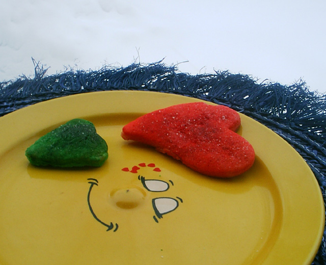 Mix sugar with a little water and add lemon juice. Divide frosting into three parts and mix the red food coloring in one part, the green in another and leave one part white. Frost cookies with alternating colors, using red frosting on green cookies, etc.