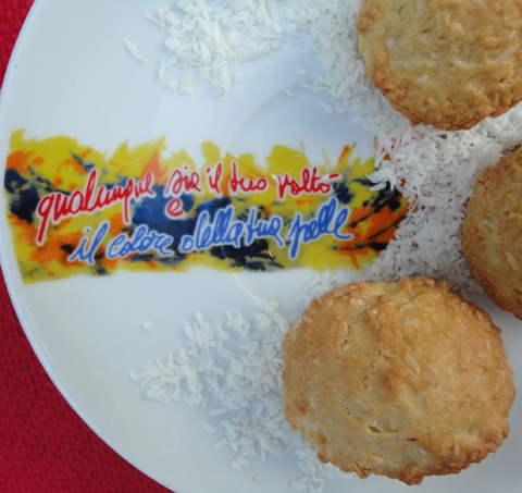 Mettere su una spianatoia la farina a fontana, il cocco, lo zucchero, il burro, il lievito, il tuorlo e l'uovo. Impastare fino ad ottenere una pasta omogenea ed elastica.