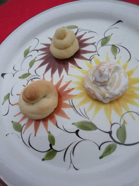 Tarallucci cookies are very difficult to make. If one doesn't like making cookies one should definitely avoid making this style of cookie. The ingredients used are simple enough, and while the directions don't look all that complicated, getting the right texture of the dough is next to impossible, unless of course, one is a really good baker. I have had the pleasure of eating many tarallucci cookies that were quite fine, but those who baked them must have had a lot of experience doing them. If one is a good baker I suggest using Mrs. Angela Giulione's recipe which is available on this website (Italy Revisited/Cookies without Nuts), rather than this one. Her recipe, in the hands of an experienced Italian baker, produces lovely tarallucci cookies, but as I'm not a particularly good baker, I didn't have success using it. I tried other tarallucci recipes and I encountered problems of all kinds -- either the dough was too soft, or too hard. If the dough is too soft, the twirls disappear in the oven; if the dough is too hard, the twirls remain, but the texture of the cookies is all wrong. I tried a number of variations (more of this and less of that etc.) and every time something wasn't quite right. Either the dough was too soft, in which case, the cookies drop while baking, losing their characteristic swirl shape, or the dough was too hard, in which case the swirl shape was retained, but the cookies were more like sweet taralli than lemon cookies. The proportions I came up with seemed to work -- the cookies retained their shape, and they tasted O.K. (Those who tried them, liked them.). The texture of the cookies was a bit harder than I would have liked it to have been, but I couldn't make the dough softer without losing the swirls. Even though I know that one can get a softer cookie texture by using "lard" rather than "vegetable oil" I went with vegetable oil because it makes the dough easier to handle. Possibly, I should have simply given up trying to make nice-looking and good-tasting tarallucci cookies and enjoyed other people's efforts. But I like the occasional challenge. So I went with it. It was kind of fun. The cookies I came up pleased me, not because they tasted better than anyone else's, but rather because they were easy to do. Well, relatively easy. Personal comments and photo: Mary Melfi. |