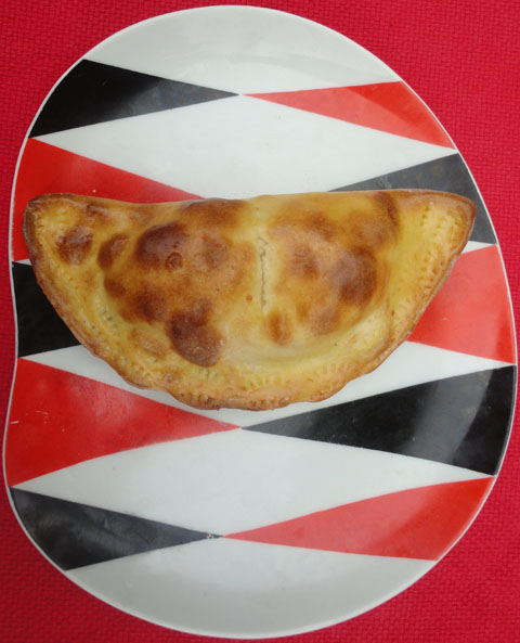 Fold over and seal the edges with a fork (Or, one can make decorative edges by pressing the side of a serrated pastry wheel cutter against the dough -- not once around the 3/4-inch edge, but three times).