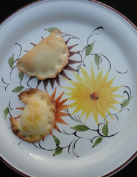 Notes It seems "fiadone" are becoming increasingly popular in Italy. Well, the word, is. The cheese-stuffed pastries were always popular but now the number of names for these delicacies seem to be on the decrease. In the past every region had its own name for their sweet or savory cheese-stuffed Easter pastries. For example in Marche they're known as "Piconi" (See Italy Revisited/Calconi for the recipe), in Sardinia they used to go by half a dozen names many of which I cannot pronounce and certainly cannot remember. In the past, "fiadone," were associated exclusively with Molisana cuisine and Abruzzese cuisine, but nowadays "fiadone" recipes are popping up in Tuscan and Campanian cookbooks. Actually what is considered a "fiadone" has expanded. In the old days (pre World War II) "fiadone" were generally thought of as large cheese-stuffed envelops rather than the individualized bite-sized tarts that they seem to be slowly turning into. Back then the over-sized "fiadone" were sliced (Guests had a slice or two and not more than that!). The savory-style "fiadone" were served at the end of the meal, not at the beginning (as they are now). Also, they were only made for the Easter festivities, and at no other time, but of course that's changing as well. "Fiadone" are still considered special treats (They're expensive to make), but not something one has to wait around for a whole year for. Nothing stays the same, especially in the cooking arena (akin to the political arena, transformations-on-the-go). "Fiadone" are relatively easy to do and that is one reason they are becoming popular. Also, they do make nice entrees when presented as mini-tarts (The shape of the tart can be as fanciful as one likes). The cheese stuffing can be varied a hundred different ways, basically any cheese and egg mixture will do. For those who don't have skill in shaping dough, one can even buy store-bought pastries and fill them, though if one did that, one could just as well buy the whole thing made (And the question is, if so many changes are made, is what one comes up with a "fiadone" or simply a no-name cheese tart?). In any case, the recipe in this entry was presented as being a traditional recipe from the Abruzzo area, but I have my doubts about that. I suspect it's a modern take on a traditional recipe. Personally I have never seen any recipe for a traditional "savory" fiadone that uses raisins or goat cheese (but then I am Not a food historian, so my opinion doesn't carry much weight). Abruzzo encompasses a wide area and its cuisine is quite varied, so this could be a traditional recipe, and if it isn't, it really doesn't matter because the "fiadone" made with this recipe is quite good. A bit unusual, but pleasant in a strange kind of way. Personal comments and photo: Mary Melfi. |