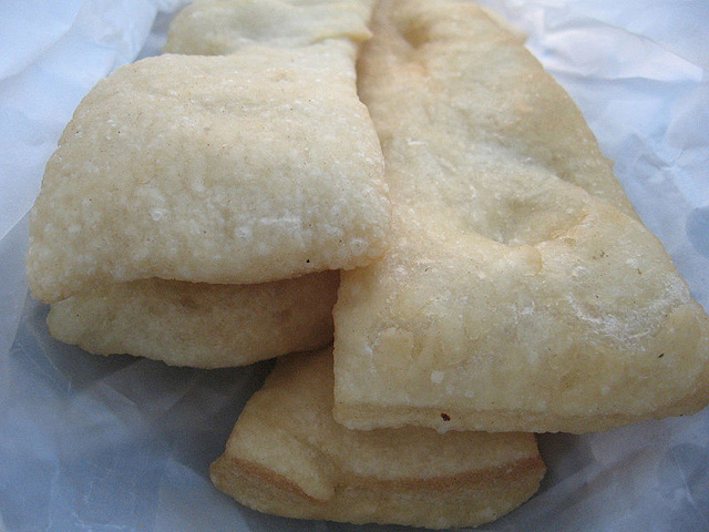 Notes Sgabei From Wikipedia, the free encyclopedia. Machine google translation. The sgabeo is a typical food of the Lunigiana . It is pasta for the bread dough, cut into strips, fried and salted on the surface that is traditionally eaten plain or stuffed with cheese or cold meats. Lately, however, it is not uncommon that the sgabeo is proposed as a sweet, filled with custard or chocolate. The recipe of sgabei originates in Val di Magra (extreme eastern Liguria), where women were frying the remaining dough from bread making and created a kind of fried bread to accompany meats and cheeses. Bread dough, however, was enriched with corn meal that made it crisp and dry. The sgabei were prepared for husbands went to work in the fields and ate them at lunch time, after which they were expertly fried in lard. Today is proposed especially during festivals, but it is hard to find warm and fragrant as a second course or appetizer in many restaurants and kitchens of La Spezia and Lunigiana. The shape is that of strips of dough about 3 cm width and length ranges from 15 to 30 cm. The frying is done in olive oil until the sgabeo not get warm and golden. Trivia. The real name of La Spezia would be "morseleti," while "sgabei" is used mostly in Val di Magra to Carrara and Val di Vara. This product is not only culinary break, but with some differences, is very popular in the rest of the Northern Italy: a mass, in Versilia and Garfagnana is called panzanelle (nothing to do with panzanella Lucca and Tuscany in general), in Emilia goes under the name of fried dumplings, while in Mantua call Pinsin.Sgabei...............Da Wikipedia, l'enciclopedia libera. Sgabei Lo sgabeo un alimento tipico della Lunigiana. Si tratta di pasta per il pane lievitata, tagliata a strisce, fritta, e salata in superficie che viene tradizionalmente consumata al naturale o farcita con formaggi o affettati. Ultimamente non per infrequente che lo sgabeo venga proposto anche come dolce, ripieno di crema pasticcera o cioccolata. La ricetta degli sgabei ha origine nella val di Magra (estremo levante ligure), dove le donne friggevano la pasta avanzata dalla produzione del pane e creavano una sorta di pane fritto da accompagnare a salumi e formaggi. La pasta del pane per veniva arricchita con farina gialla che la rendeva croccante e asciutta. Gli sgabei venivano preparati per i mariti che si recavano al lavoro nei campi e che li consumavano all ora di pranzo, dopo che venivano sapientemente fritti nello strutto. Oggi vengono proposti soprattutto in occasione di sagre paesane, ma non difficile trovarli caldi e fragranti quale seconda portata o antipasto in molti ristoranti e cucine dello spezzino e della Lunigiana. La forma quella di strisce di pasta lievitata della larghezza di 3 cm circa e della lunghezza variabile dai 15 ai 30 cm. La frittura avviene in olio d oliva fino a quando lo sgabeo non diventa caldo e dorato. Curiosit Il vero nome spezzino sarebbe "morseleti", mentre "sgabei" usato per lo pi in Val di Magra fino a Carrara e Val di Vara. Questo prodotto culinario non solo spezzino, bens, con qualche differenza, assai diffuso anche nel resto dell'Italia Settentrionale: a Massa, in Versilia e in Garfagnana chiamato panzanelle (niente a che fare con la panzanella lucchese e toscana in genere), in Emilia va sotto il nome di gnocco fritto, mentre a Mantova lo chiamano Pinsin. Photo: Wikipedia  |