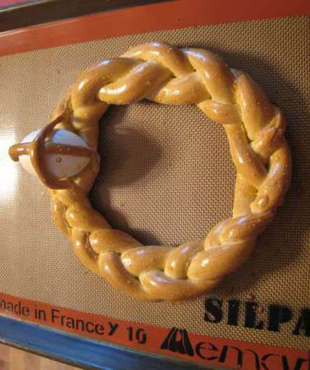 Notes In Santa Croce braided Easter logs were known as "turtel." Tony Alfieri, Mary Melfi's brother-in-law, recalls that when he was growing up in Santa Croce in the late 1940s it was the custom to make "turtel" and give them to young boys as presents for Easter. The "turtel" were made with "sweet taralli dough." However, he himself does not know the recipe that was then in use. All he is sure of is that the cooks used a sweet taralli dough to make the Easter treats.... The "turtel" shown in the photo to right was made by Tony Alfieri. |