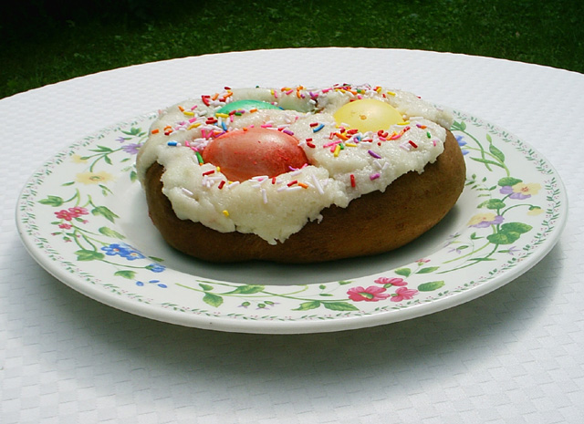 Place dry colored eggs into apaces in the twists; cover and allow to rise until dough doubles in bulk, about 45 minutes to 1 hour.