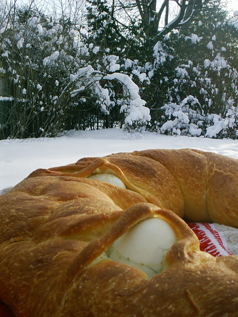 Place 2 of the hard-boiled eggs in center top of each loaf, and cover with 2 strips of the reserve dough about the size of a banana.
