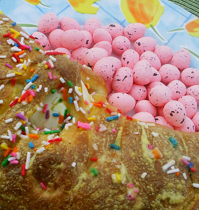 Place hard-boiled eggs in centers or in positions desired, using strips of dough to form picture desired.