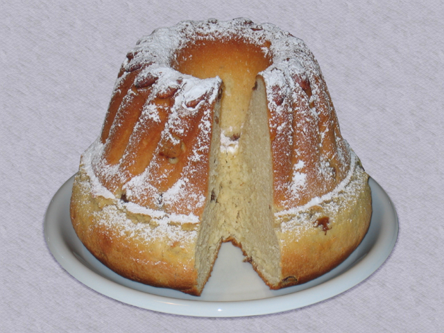 Notes The recipe in this entry was taken from "La Scienza in Cucina e L'Arte di Mangiar Bene manuale Pratico per le Famiglie" compilato da Pellegrino Artusi. The book was first published in 1891. Since then many Italian editions have been published. English translations of this cookbook under the title "Science in the Kitchen and the Art of Eating Well" are available. At www.archive.org Olga Ragusa's selection of recipes from Pellegrino's famous Italian cookbook can be found in its entirety (It's free to download). Her selection entitled, "The Italian Cook Book," was first published in 1945 by S.F. Vanni.... The following notes come on the Gugelhupf come from Wikipedia, the free encyclopedia (Redirected from Kugelhupf): "Gugelhupf Origin Alternative name(s) Gugelhopf, Kugelhopf Place of origin Germany, Austria, Switzerland and Alsace Details Type Bundt cake Main ingredient(s) Yeast dough with raisins, almonds and Kirschwasser A Gugelhupf or Gugelhopf is a southern German, Austrian, Swiss and Alsatian term for a marble cake or Bundt cake. Supposedly the part "Gugel-" is a variation of the Middle High German word gugel (hood), and the part "-hupf" is a variation of "Hefe" (yeast). In Hungary the spelling is kuglf, in Croatia and Serbia the spelling is kuglof, in France kouglof and in Romania it's called guguluf. In the Czech Republic and Slovakia, it is called b?bovka, and in Poland babka. In the Republic of Macedonia the cake is known as куглоф (transliterated, kuglof). In Upper Austria it has a different name: "Wacker" or "Wacka". In Slovenia, the standard word is ?arkelj. In Western Slovenia, it is also known as kuglof, and in Central and Eastern Slovenia, kugluh. The pastry Central European marble cake A two colored Czech version called "Bbovka", the dark brown is from the usage of cacao. Gugelhupf is a big cake, derived from the Groninger Poffert, and has a distinctive ring shape or the shape of a torus. It is usually eaten with coffee, at coffee breaks. Gugelhupf consists of a soft yeast dough which contains raisins, almonds and Kirschwasser cherry brandy. Some also contain candied fruits and nuts. Some regional varieties (Czech, Hungarian and Slovenian) are also filled, often with a layer of sweetened ground poppy seeds. It is baked in a special circular pan with a central tube, originally made of enamelled pottery. Similar pans are used for making Bundt cakes, a cake baking pan shape in the US derived from the Gugelhupf. The Gugelhupf was the sweet chosen to represent Austria in the Cafe Europe initiative of the Austrian presidency of the European Union, on Europe Day 2006." Photo: Wikipedia. |