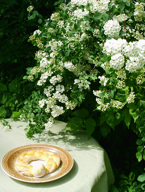 In Casacalenda, Molise, the braided Easter log was generally presented in a circular or coiled shape and given to young boys as gifts (Girls were given "pupatta" Easter cookies). The cookies were given on Easter Sunday, but they were actually supposed to be eaten on Easter Monday when families went to the countryside and there had picnics. Some cooks made the carosello with pasticcino or cookie dough others used sweet taralli dough (See recipe, Carosello Version II and Version III) Photo: Mary Melfi. |