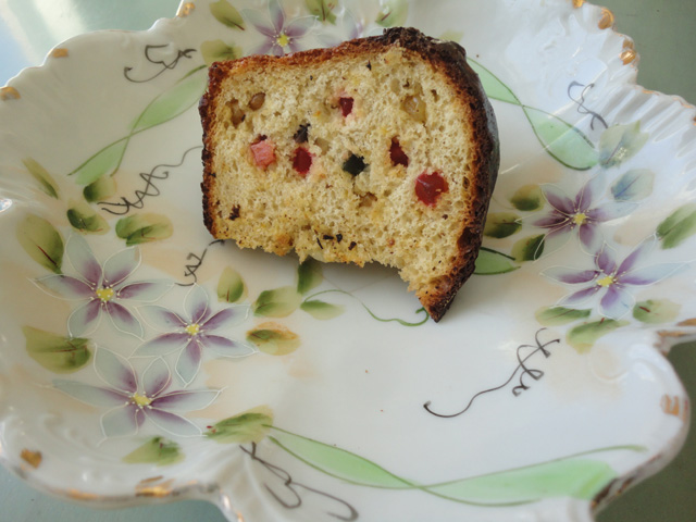 Notes The recipe in this entry was adapted from one published in, "Sunset Italian Cook Book" by the editors of Sunset Books and Sunset Magazine (Menlo Park, California: Lane Publishing, 1981). The cookbook can be borrowed for free from the on-line public library, www.openlibrary.org.... The following text comes from from Wikipedia, the free encyclopedia (Machine google translatin). A typical cake origins Place of origin Italy Italy Lombardy Region Production Area Milan Details Category sweet Recognition P.A.T. Sector fresh pastries and bakery products , biscuits, cakes, pastry and confectionery Christmas Showcase Pears to Nebbiolo with ice cream and cake Panettone, in Lombard panaton or Panattone phonetic pronunciation IPA:/ panatoŋ/ or/ panatuŋ/) , is a typical dessert of Milan, associated with the culinary traditions of Christmas and widespread throughout Italy. Panettone traditional Lombard is known that high, but there is also a low and wide variation in Piedmont, said Galup Typically has a cylindrical base of 30 cm in height that terminates in a dome shape. Bases or octagonal star-shaped section are more common for the Pandora . It is made from a yeast dough made with water, flour, butter , eggs (yolk), to which are added candied fruit, candied orange and citron in equal parts, and raisins. The result is commonly referred panetton CANDIO . The cake was born in Milan at the time of Ludovico il Moro, and it is still produced according to the 500 years ago. In Milan until 900 were among many bakers and confectioners to produce the cake , but today large industrial firms are located panettone in Italy, and Milan are still many artisans who produce a cake according to the traditional recipe. Today Panettone is a typical sweet Italian protected since 2005 by a specification , which specifies the ingredients and the minimum percentage to be defined as such.History and stories Panettone The origins of panettone sometimes fade into legend. There are two stories that have the most credit: Messer Ughetto of Atellani, falconer, lived in Contrada delle Grazie in Milan. In love with Algisa , beautiful daughter of a baker, he became the father take her as an apprentice, and to increase sales , he tried to invent a dessert: the best kneaded flour mill eggs , butter, honey and raisins. Then it baked. It was an amazing success , everyone wanted to try the new bread and some time later the two young lovers were married and lived happily ever after . The cook in the service of Ludovico il Moro was instructed to prepare a sumptuous Christmas dinner to which were invited many nobles of the district, but the sweet, forgotten in the oven, almost charred . Given the desperation of the cook, Toni, a little kitchen boy , proposed a solution: " With how much is left in the pantry - a little 'flour , butter, egg, lime zest and some raisins - this morning I cooked this cake . If you have nothing else , you can bring it to the table. " Cook agreed and , trembling , stood behind a curtain to spy on the reaction of the guests . Everyone was thrilled and the Duke, who wanted to know the name of that delicacy, the chef revealed the secret : " This is the bread of Toni." Since then it is the " bread of Toni " , or the " cake." Panettone through the ages Pietro Verri describes an ancient custom that in the ninth century animated the Christian feasts related to the Milan area at Christmas the whole family gathered around the hearth waiting for the pater familias would break a " big bread " and it progresses a piece at all present as a sign of communion. In the fifteenth century , as ordered by the ancient statutes of the guilds, the bakers in the shops of Milan kneaded the bread of the poor ( millet bread , called pan de mej) was forbidden to produce bread of the rich and noble (white bread, said micca) . With one exception : on Christmas Day, when aristocrats and plebeians could eat the same bread, donated by bakers to their customers. It was scior pan or pan de ton, which is the bread of luxury, pure wheat, stuffed with butter , honey and raisins . At the end of the eighteenth century there was an unexpected newness : the Cisalpine Republic undertook to support the work of artisans and merchants in Milan promoting the opening of the furnaces, the world of delights which flickered in the busy prestinee, and pastries, enchanted kingdom of offellee . During the nineteenth century , during the Austrian occupation, the cake became the irreplaceable character of an annual habit: the governor of Milan, Ficquelmont , he used to offer it as a personal gift to Prince Metternich . The recipe for the cake is taken by Angelo Vergani in 1944 , the founder of Vergani, a company that still produces the cake in Milan. The poet pastors, one of the most popular poets in Milan 900 mentions this type of cake in one of his poems. Panettone di San Biagio In Milan , it is tradition to preserve a portion of the cake eaten during the Christmas lunch , then eat stale fasting together as a family February 3 , feast of the saint , as a propitiatory gesture against the evils of the throat and colds, according to the saying of Milan " San Bias and benediss throat and el nas ( San Biagio blesses the throat and nose ) " . On this day the shopkeepers to sell the unsold sell cheap so-called panettone of St. Blaise, the last remaining from the festive period. production Traditional panettone Trunks Almost 100 million pieces of Panettone and Pandoro were produced in Italy in 2008 for a value of approximately 600 million Euros . ingredients For the production of the cake is handcrafted using only the following ingredients: water flour 0 salt Fresh eggs and / or egg yolk pasteurized milk Butter and / or margarine sugar Candied fruit (especially orange and citron ) raisins vanilla brewer's yeast sourdough The process of production [edit | edit source ] The production process of the typical Panettone Milanese artisan tradition involves the following phases