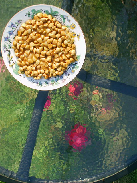 o Add the lightly roasted and coarsely chopped almonds to the sugared water and continue cooking on low heat until all the almonds are nicely coated with sugar -- about 3 minutes.