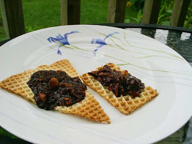 Directions "Boil half a pound of honey in a copper vessel, and then add to it a few blanched almonds and filberts cut in halves or quarters and slightly browned, a little candied lemon peel, a dust of pepper and powdered cinnamon and a quarter pound of grated chocolate. Mix all well together and gradually add a tablespoonful of cornflour and two of ground almonds to thicken it. Then take the vessel off the fire, spread the mixture on large wafers, and make each cake about an inch thick. Garnish them on the top with almonds cut in half, and dust over a little powdered sugar and cinnamon, then put them in a very slow oven for an hour." Notes This recipe was taken from "The Cook's Decameron: a Study in Taste, containing over two hundred recipes for Italian dishes," by Mrs. W.G. Waters. It was published by William Heineman in 1920. For the entire copyright-free cookbook see www.archive.org...... P.S. I tried this recipe and found the cookies to be the strangest I have ever tried in my life. They're not bad, but they are strange. I can't compare them to anything that is part of Italian cuisine -- they come closer to South American cuisine as far as I can tell. Other Italian cookies make use of cloves and nutmeg, but pepper??? Not that I know of. That said, they do taste a lot like "mostaccioli." Those who go crazy for "mostaccioli" might go crazy for these too. The presentation of the cookies though is different from "mostaccioli." Basically, the look of these cookies is similar to torrone, except the cookies are presented on one wafer, rather than sandwiched between two. If I were to re-do this recipe I would not bake the cookies for an hour, perhaps five minutes or so, but any longer than that simply burns the wafer. Possibly, the type of wafer that was used in Italy at the turn of the last century could be baked, but nowadays the ones that are available don't take well to it. In any case, there seems to be no recipe on the internet for this style of cookie. That may mean the cookie is no longer done in Italy, or it may simply mean that the name of the cookie has changed. Hard to say..... Photo: Mary Melfi. |