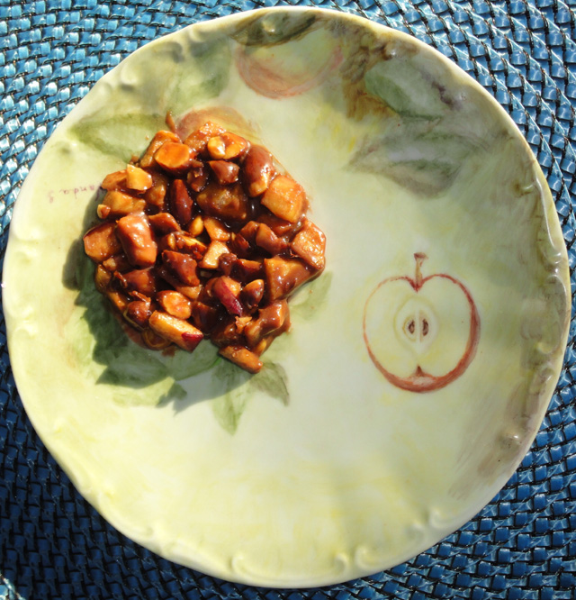 Notes The following text comes from the Italian Wikipedia (Machine google translation): Croccante. "The crisp is a sweet, typical of many areas of Italy, consisting of sugar melted and re-solidified with almonds, hazelnuts or walnuts, one side can be covered by a wafer.The history: The recipe for crispy reported by Pellegrino Artusi in the section of his famous pastry cookbook "The Science in the Kitchen and the Art of Eating Well." The crisp is quoted on the Spanish text of the second half of the fifteenth century, this might suggest that his birth took place just in Spain. But many argue that this traditional sweet, has Italian origins, born around '200 in the south of Italy as a byproduct of a traditional Arabic sweet, made with almonds, honey, sugar and spices. Recipe To learn more, see item # Caramel Caramel dark. The recipe and method of preparation are very simple. It is melt over low heat in a saucepan not tinned or in a pot the sugar powder, continuing to shoot it with a ladle of wood: once liquefied sugar or when he took the typical color blondish, not too dark so do not become too bitter and caramelized, add the blanched almonds or freshly roasted, or any other ingredient at will as those listed above. Continue to turn briefly to mix well and pour on a mold or a slab of marble cold. The amalgam may also be paid on a host. It generally helps with a spatula to spread well. The product will soon solidify and can be served sliced or in pieces. According to some recipes it helps to melt the sugar with the juice of lemon which also gives a certain aroma. In order to facilitate the detachment of the mold from marble or you can help by wetting the surface with a drop of oil or butter.Variety of crisp Today there are many varieties of crispy almonds in which the original recipe are replaced by other types of nuts or other ingredients of the most common you can find crunchy peanuts but also sesame seeds , the popcorn , the nuts , the nuts , the pine nuts ... You can find different types of sweets like crunchy Italian a bit 'everywhere in the world but the simple original recipe is modified with other ingredients such as leavening agents of various kinds, peanut butter , butter . Of course with the sugar used many other types of nuts or other ingredients that are not common in Italy. The crunchy today The crisp is a typical sweet that is located at the stalls of sweets fairs and festivals festivals. ............... Original Italian Text: Croccante alle nocciole Origini Altri nomi Torrone di mandorle Luogo d'origine Italia Dettagli Categoria dolce Ingredienti principali Zucchero, Mandorle Varianti Noci, Nocciole, ... Croccante di mandorle Il croccante un dolce, tipico di molte zone d'Italia, composto da zucchero fuso e risolidificato insieme a mandorle, nocciole o noci; da un lato pu? essere ricoperto da un'ostia. La ricetta del croccante riportata da Pellegrino Artusi nella sezione dedicata alla pasticceria del suo famoso libro di ricette "La Scienza in cucina e l'Arte di mangiar bene". Il croccante citato su un testo spagnolo della seconda met del quattrocento, ci potrebbe indurre a pensare che la sua nascita sia avvenuta proprio in Spagna. Molti per sostengono che, questo tipico dolce, abbia origini italiane, nato intorno al '200 nel sud d'Italia come derivazione di un tipico dolce arabo, fatto a base di mandorle, miele, zucchero e spezie. Ricetta Per approfondire, vedi la voce Caramello#Caramello scuro. La ricetta ed il metodo di preparazione sono molto semplici. Si tratta di fondere a fuoco lento in una casseruola non stagnata o in un paiolo lo zucchero in polvere, continuando a girarlo con un mestolo di legno: una volta liquefatto lo zucchero ovvero quando ha assunto il tipico colore biondiccio, non troppo scuro in modo da non farlo diventare amaro e troppo caramellato, aggiungere le mandorle sbucciate o appena tostate, oppure qualsiasi altro ingrediente a piacimento come quelli sopra elencati. Continuare a girare brevemente per amalgamare bene e versare su di uno stampo o una lastra di marmo fredda. L'amalgama potr? essere versata anche su un'ostia. In genere ci si aiuta con una spatola per stendere bene. Il prodotto presto solidificher e potr essere servito affettato o a pezzi. Secondo alcune ricette si aiuta a fondere lo zucchero con del succo di limone il quale d anche un certo aroma. Per favorire il distaccamento dal marmo o dallo stampo ci si pu aiutare bagnando la superficie con una goccia di olio o burro. Variet di croccante Oggigiorno esistono molte variet? di croccante nelle quali le mandorle della ricetta originaria sono sostituite da altri tipi di frutta secca o altri ingredienti: tra i pi comuni si possono trovare croccanti alle noccioline americane ma anche ai semi di sesamo, al popcorn, alle nocciole, alle noci, ai pinoli... Si possono trovare diverse tipologie di dolci simili al croccante italiano un po ovunque nel mondo ma la semplicissima ricetta originale modificata con altri ingredienti come agenti lievitanti di varia natura, burro di arachidi, burro. Naturalmente insieme allo zucchero sono utilizzati molti altri tipi di frutta secca o altri ingredienti non comuni in Italia. Il croccante oggi Il croccante un tipico dolce che si trova alle bancarelle dei dolciumi di fiere e sagre paesane. Riconoscimenti Esiste un "Croccante artigianale del Frignano" tutelato dal Marchio collettivo "Tradizione e sapori di Modena" della Camera di Commercio di questa citt?.(Croccante artigianale del Frignano)..... P.S. This recipe is difficult to do as the apples don't adhere to the almonds very well. Personal comments and photo: Mary Melfi. |