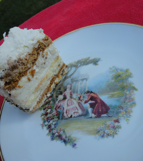 Spread a thin layer of cream on the last disc and scour (with a sieve with large holes) on top of it the pieces of dough.