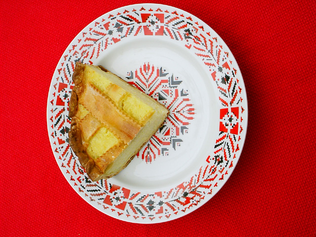 Gild the upper crust of the pie with an egg yolk, and bake in the oven.