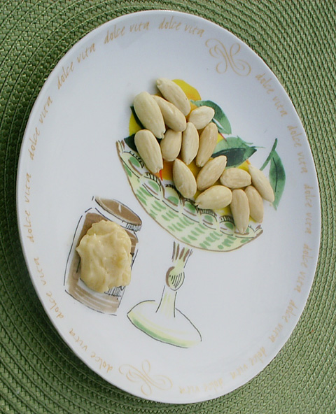 Directions Pound almonds, 4 yolks and 1 tablespoon powdered sugar to a paste.