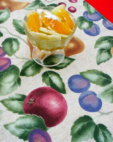 Directions Slice oranges and apples very thin, mix, dust with powdered sugar, and add a generous amount of Marsala wine.