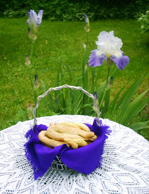 Mrs. Rosina Melfi, a first-generation Italian-Canadian, notes that prior to World War II "biscotti con sale" were considered high-end taralli as the dough that was used to make them was well-kneaded while the dough used to make taralli was not. Back then taralli were always presented in a circular shape, while "biscotti con sale" were presented as half bows [For more information on this subject see "Biscotti con Sale, Version I"].... In any case, the recipe presented here is her own particular version for "biscotti con sale" and not the one her own mother did when she was growing up. She adapted the traditional "biscotti con sale" recipe which uses whole eggs rather than egg whites in order to make use of egg whites she has left over when she makes other recipes (e.g., Italian custard). She finds the combination of egg whites and white wine turn out a crunchier biscotti than one that follows the traditional recipe.... Photo: Mary Melfi. |