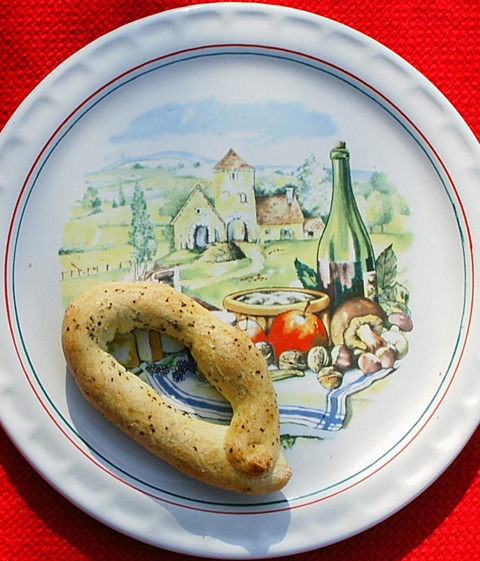 Cut a small chunk of dough and using the palms of your hands make a thin taralli-style log -- about 10 inches long by 1/4 inch thick.