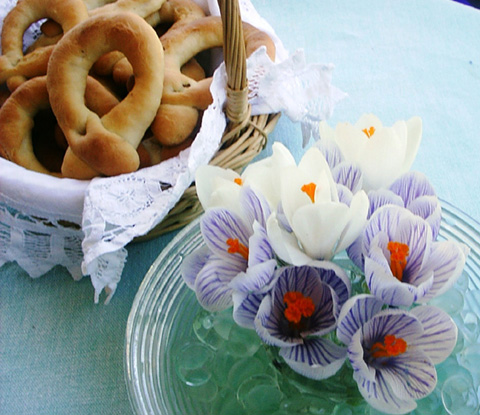 Mrs. Angela Giulione indicated that in the 1930s when she was growing up in Montefalcione, Campania taralli were only prepared for the Christmas holidays. As far as she remembers very few people in her area did them during the grape harvest, though those that did do them offered them to the men in the family who dunked them in wine. Of course, nowadays she does them any old time. Taralli are no longer considered a special treat.... Photo: Mary Melfi. |