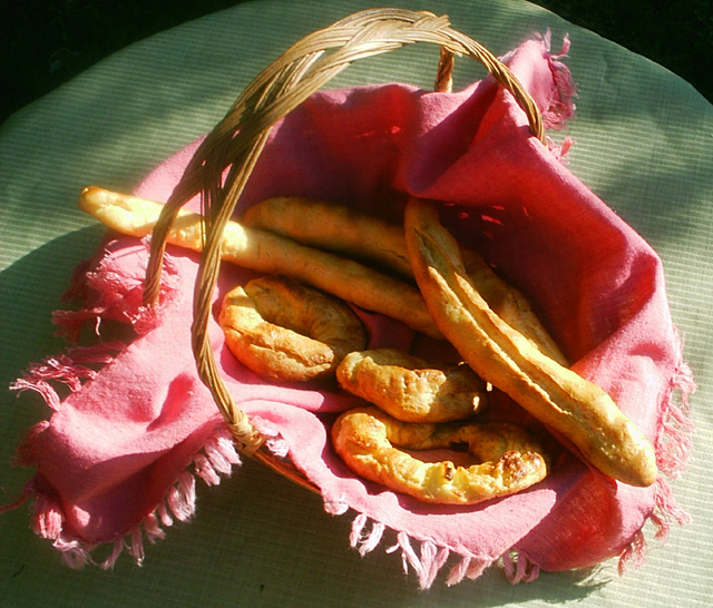 Notes According to Mrs. Rosina Melfi, a first generation Italian-Canadian who grew up in Casacalenda in the 1930s, this style of sweet taralli was considered a second-rate version of "biscotti dolci" as the taralli (unlike "biscotti dolci") did not require much kneading. Apparently, in the 1930s "biscotti dolci and "taralli dolci" were not one and the same recipe. Back then "biscotti dolci" took time and effort to make and so were only made for special occasions, while "taralli dolci" were made any old time [For more information on this see Italy Revisited/Taralli, "Biscotti con Sale, Version I]. Apparently, in the 1930s "taralli dolci" were made in a round donut-like shape, while "biscotti dolci" were made in the shape of half-bows. The shape of the treat would indicate whether or not they were plain old taralli or they were the beloved "biscotti dolci." Nowadays most North Americans (and I suspect Italians as well) don't make any distinctions between "biscotti dolci" and "taralli dolci." It seems the recipe name, "biscotti dolci" is no longer in use. Nonetheless, prior to World War II the term "biscotti dolci" was very much in use.... It's interesting to note that the word, "taralli," in Molisani dialect not only refers to the Italian snack food North Americans that have come to love, the word also refers to young men who may think themselves hot, but are, in fact, not hot at all. Apparently, in the 1930s young women would also refer to such men as "taralli that had been soaked in honey" -- an obvious put down as taralli are never soaked in honey.... According to my aunt, Zia Rosina, the word, taralli, may have come to have been used in this derogatory fashion, because back in the 1930s taralli (as previously noted) were low in the food hierarchy. Apparently, when someone baked something and it didn't come out right the townspeople would say, "it looks like a taralli" -- meaning, it doesn't look like much. In a nut shell, taralli were considered second-rate "biscotti con sale" and/or "biscotti dolci...." In any case, the original Molisani-style "sweet taralli" are very different from what most North Americans have come to expect of this snack food. First of all, they are not very sweet, and second of all, they're not crunchy. They taste more like a "holiday bread" than "taralli." The taralli that are currently available in North American grocery shops are more like those that were made (and still are made) in Campania and/or Puglia, rather than what were made (and possibly still are made) in Molise. That said, these Molisani-style sweet taralli may be different from the norm, but they're still very pleasant to eat. Those who don't like their sweet taralli to be "too" dry or "too" sweet might actually prefer this style of taralli dolci to the more famous ones from Bari and its surrounding area.... Photo: Mary Melfi. |