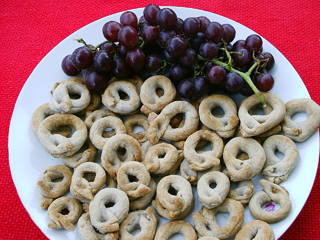 Supposedly, the word, "ciambelline," can be translated as "small donuts," though there is nothing donut-like about this recipe. Of course, there are a number of Italian recipes that go by the name of "ciambelline" and not all of them are taralli recipes. However, this particular one is. It comes from Florence, Tuscany. According to food historians the Florentine "ciambelline" is made with flour, sugar, olive oil, red wine and anise seeds. An on-line store [www.la-madia.com] where one can purchase Tuscan-style ciambelline indicates that their pastry chefs use flour, olive oil, wine, sugar, and vanilla. Other sites on the world-wide web list similar ingredients for Tuscan-style ciambelline, except some cooks dip their ciambelline in sugar prior to being cooked, while others brush them with oil. In any case this recipe for Tuscan-style ciambelline is one of the easiest to do and is quite good. Photo: by the contributor. |