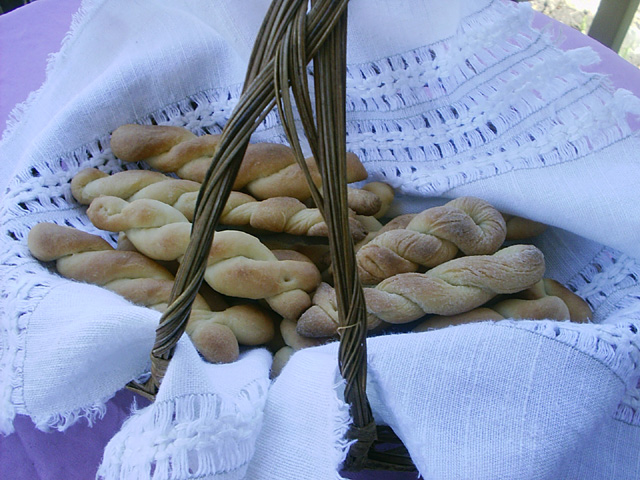 Notes Mrs. Angela Giulione notes that in the 1930s, when she was growing up in Mondragone, Caserta, Campania, trecce were only made for the Feast Day of San Slyvester -- January 1st. In some areas of Italy San Slyvester's feast day is celebrated on December 31st (The official Catholic Church's name day for this saint) but in other areas, this feast day is combined with New Year Day's festivities. In any case, when Mrs. Angela Giulione was growing up in Mondragone, Caserta, Campania the trecce were only eaten on New Year's Day (San Slyvester's Feast Day) and at no other time. Apparently, San Slyvester's feast day was celebrated a bit like Halloween is celebrated in North America -- children went around "trick or treating." On the Feast Day of San Slyvester the children in Mondragone, would knock on their neighbors' doors (in the late afternoon) and sing the following song: "Saint Sylvester was born early and now we are here so give us something to eat." They went in groups of 3 or 4, and often one of the older children would beat a home-made instrument (e.g. a bucket) and make music (And/or noise). According to Mrs. Giulione the festivities were kept within the neighborhood -- the children stayed close to their homes (They did not visit relatives who lived far away). Generally, only four or five groups of children came by (A hostess would not have hoards of kids to feed). Anyway, after the children had sung their little song and had beaten their home-made instruments they were given the "trecce" as a treat or reward for their efforts. Of course, as the trecce were only made once a year (unlike Halloween candy which can be had any old time), they were very much appreciated. Actually, even if they had been made more frequently, they would have been appreciated for these taralli dolci are incredibly tasty. Tasty and wholesome.... .... This recipe is not too difficult to make, though twirling the trecce-rope round itself proved quite a challenge, so I only did a few of those [They're the two seen on the right side of the photo which have the indentations]. However, braiding the trecce was quite easy. These sweet taralli from Campania are delicious, not as delicious as if one only had the pleasure of eating them once a year, but delicious enough. The recipe is worth the effort.... Photo: Mary Melfi. |