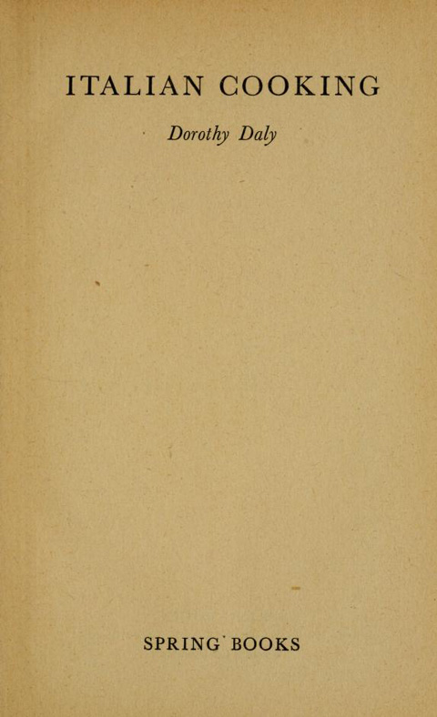 "Italian Cooking" by Dorothy Daly was published by Spring Books in London, England (There is no publication date given in the book itself, though The Boston Public Library's call number, "TX 723.D295 1900 Zx," suggests the book was published in 1900. However, this is a cataloging error. Possibly, the book was published in 1960 as some other sources might suggest. The complete cookbook is currently available for free at www.archive.org. Technically a book has to have been published prior to 1921 in the United States for it to be in the public domain, but sometimes the author and/or his heirs, place the book in the public domain so that individuals can have access to it. Whether this is the case for this particularly book is hard to say. Still, the book can be accessed without cost at the on-line public library: www.archive.org. |