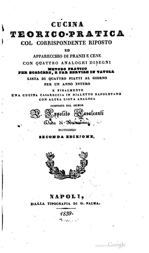The Italian cookbook, "Cucina Teorico-Pratica col corrispondente riposto ed apparecchio di pranzi e cene con quattro analoghi disegni," compiled by Ippolito Cavalcanti and published in Naples by Di G. Palma in 1839 is beautifully put together. Cavalcanti generally provides precise measurements and easy to read directions on how to make the dishes. He also devotes an entire section of the book to recipes specific to Naples, using the local dialect. Why this book is not well-known is a mystery. The book is available for free at www.archive.org....... The following notes are taken from Italian Wikipedia (Machine google translation). BIOGRAPHY: "Ippolito Cavalcanti, Duke of Buonvicino (Afragola , 2 September 1787 - Naples, 5 March 1859 ) was a cook and Italian writer. Descended from an ancient family noble line from which the most famous poet Guido Cavalcanti , a friend of Dante. The family in 1311 he left Tuscany to move to Calabria, where in 1331 Joan I appointed viceroy one of Cavalcanti. In 1795 the family received the title of Duke of Buonvicino . WORKS: His [Ippolito Cavalcanti] treatise Kitchen theoretical practice, published for the first time in Naples in 1837 to which he adds, in the second edition of 1839, the appendix Cusina casarinola in the Neapolitan language, presents numerous recipes of the time, from different social classes. The book had, from 1837 to 1865 nine editions, quite different from each other as they were constantly being expanded by the author. The theoretical and practical kitchen is a compendium of traditional Neapolitan cuisine, some of the recipes are inspired by the French, as the kitchen side of the Alps at the time was very present on the tables of the aristocracy or the upper middle class, the appendix us back instead style cooking in use at the time to the people. The compendium in dialect is of considerable importance from the point of view of history, as they are described in some of the recipes in the most common modern Italian cuisine. There is, for example, the first description of a pasta (vermicelli) topped with tomato. There are many other recipes in these works, and some of them are clearly recognizable traits of what is the modern Neapolitan cuisine, especially Italian and, in general. The following non-exhaustive list: Eggplant Parmigiana, Fried Pizza,Vermicelli with Clams and Vermicelli with Tomato,
