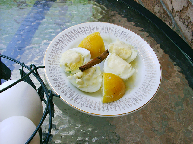 Directions "Hard boil four eggs; cut into several pieces. Then prepare the following: Boil down to a syrup one heaping tablespoon of sugar, rind of one-quarter of lemon, one scant cup of water, and a little piece of cinnamon. Then remove the lemon-rind and the cinnamon, and add one cup of milk or cream. When heated through, take off of fire, and add the yolks of four eggs, beating well together. Then pour the sauce over the hard-boiled eggs in a shallow baking-dish, put it in a very moderate oven, and bake. Before serving squeeze on a little lemon juice and garnish with squares of fried bread."
