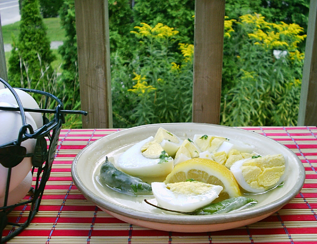 Directions "Chop up fine one pickled pepper, one teaspoon of capers, one-half small pickled onion and one pickle, and some parsley. Dissolve in boiling water one tablespoon of butter, add the juice of one-half of lemon, a pinch of flour to give a little body, and the chopped pickles. If too sour add some sugar. Hard boil four eggs, cut them in four, and pour over them the sauce."