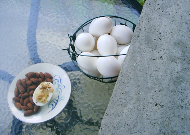 Directions "Hard boil four eggs, divide them in half, and pour over them the following sauce: Put two tablespoons of vinegar into a saucepan and one tablespoon of sugar (brown or white), fifteen almonds chopped up fine, and a small piece of candied citron. Let it boil for a little while, then add a pinch of cinnamon, cloves, pepper, and salt, and if too acid add a little water. Before taking off the stove add a little flour to give body to the sauce. Pour over the eggs and serve."