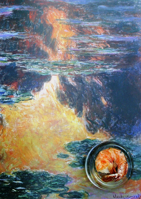 Directions Place thin slices of hard-boiled egg on crostini (croutons) or ordinary toast; spread with a thick salad dressing that has garlic salt added, then top with a shrimp and finely chopped watercress. Notes This recipe was taken from "The Complete Italian Cook Book: La Cucina" by Rose L. Sorce. It was published by Grosset & Dunlap in 1953. For the entire copyright-free cookbook see www.archive.org.... Image -- Claude Monet: Nympheas, 1907. |
