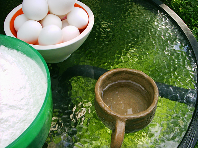 Notes The recipe for home-made pasta was taken from "Italian Cooking" by Dorothy Daly. It was published by Spring Books in Great Britain. For the complete copyright-free cookbook see www.archive.org. The cookbook author, Dorthy Daly, includes an extensive introduction to her pasta section which could have been written in the 21st century. Daly got everything right, including the fact that the making of pasta in Italy predates Marco Polo's travels. In her introduction she writes: "The Italian term Pasta covers a multitude of various shapes and forms of what we in England tend to lump together in our minds under the heading of Macaroni or Spaghetti. For centuries now Pasta has formed an integral part of the Italian diet, but whether or not it originated in that country is open to question. One theory is that it was among the many curiosities and wonders brought back by the traveller Marco Polo when he returned to Italy during the 13th Century after years of travel in the Orient, and in an account of his travels there is a description of the Chinese making a kind of dough which they cut in strips and dried in the sun, which strips he refers to by the Italian name of Lasagne, the name used to this day in Italy for one of the broad, flat ribbon-type Pastas. Earlier than Marco Polo, however, there is a reference to Pasta in Italian literature, in the Life of the Blessed Hermit William, a holy man who lived around the year 1200, which rather discounts the Marco Polo legend. It looks as though we are safe to assume that Macaroni has as good a chance of being native to Italy as Noodles have of being of Chinese origin; the name given to the kind of Pasta matters less for the purpose of this book than the various ways of cooking the product. A word first of all about the various types of Pasta to be met with in Italy. Starting with the fine string-like vermicelli, too fine to have a bore through its centre, the tubular types come in all widths from the regular and familiar Macaroni and Spaghetti, to the three-inch lengths of Canneloni, three-quarters of an inch in diameter which, after a preliminary cooking in boiling water are stuffed and re-cooked in various ways, and served up with sauce, or with cheese and butter. There are the fancy shapes of Pasta, Shells, Elbows, Cart-wheels, Twists, even Alphabet Letters, and there are the various flat types, the narrow Noodles, the broader Tagliarellini, progressing to the broad Lasagne, and there are also the tiny rice-type grains known as Pastina, and small star-shapes used as a garnish for soups. The variety is infinite and the possibilities of cooking the various types into tempting dishes are endless. Cooking Procedures Provided one remembers a few simple rules, nothing could be much simpler than the cooking of Pasta. 1. See to it that you use a large utensil, a really capacious saucepan in which is an ample quantity of really boiling water ? allow at least a gallon of boiling water per pound of pasta, and to each gallon add a tablespoonful of cooking salt. Before attempting to add the Pasta, see that the water is at a proper boil, and add the Pasta slowly so as not to let the water go off the boil, for once the temperature of the water drops below boiling point you are running the risk of having your Pasta turn into a soft, rubbery mass, instead of the desired separate strands or pieces, depending on which variety of Pasta you are cooking. If you are using the long, uncut Spaghetti or Macaroni, don't spoil the Italian appearance of your finished dish by breaking the Pasta into shorter lengths; don't get alarmed if at first the long ends stick out of your saucepan of water, once the submerged part has been heated through it will soften sufficiently for you to be able to persuade the long ends to follow suit. One reason for the emphasis on using a large enough saucepan is the need to allow for the 'frothing' that takes place when once the Pasta itself reaches boiling point; lower your heat a trifle when this occurs, but not sufficiently to let the water drop below boiling point. From time to time run a fork or spoon around your saucepan to loosen any stray ends of Pasta that may adhere to the bottom or sides of the utensil. 2. Whatever you do, don't fall into the error of over-cooking your Pasta, and where cooking time is concerned, you may have to go through a period of trial and error before you discover the correct cooking time for your own particular taste. The true Italian likes to be able to bite his cooked Pasta: he will tell you it must be 'al dente' (to suit the tooth), but while it must certainly not be soft enough to dissolve in the mouth, it must need only the tenderest of 'bites', such as you might give to ? shall we say ? a piece of Shrove Tuesday pancake. The cooking time will vary with the different varieties and thicknesses of the Pasta, and it is a fairly safe maxim in the early days of Pasta-cooking to study the instructions given on the package of whichever type you choose, and to cook your Pasta a minute or so less than the time suggested, then fish out a small piece and test it for yourself either by biting through it, or by pressing it between two fingers. A few experimental 'trial runs' will soon give you a guide to your own best cooking times. The following table will be helpful in a broad sense, but your own experience will eventually stand you in better stead than any instructions. 3. TABLE OF COOKING TIMES (Approximate only) Ordinary spaghetti 8 ? 12 minutes Very thin spaghetti, vermicelli 6 ? 10 minutes Long macaroni 10 ? 12 minutes Macaroni shells, wagon wheels etc 8 ? 12 minutes Broad noodles such as lasagne 6 ? 9 minutes Medium noodles ? tagliatelle 4 ? 6 minutes Alphabet macaroni, pastina (the ricelike macaroni used in soup), small stars, etc. 5 ? 7 minutes Rigatoni or gavatoni (very large macaroni) 10 ? 12 minutes And remember, the home-made Pasta needs usually no more than half the length of time to cook in comparison