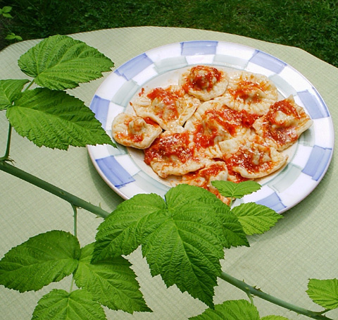 Notes This recipe was taken from "Italian Cooking" by Dorothy Daly. It was published by Spring Books in Great Britain. For the complete copyright-free cookbook see www.archive.org........ In the introduction to the ravioli section Daly says:"Having mastered the cooking of pasta of the macaroni and spaghetti variety, let us now proceed to the more involved types known broadly as 'ravioli' and 'gnocchi. Both may be made at home, and after a little practice made well, and although it is possible to purchase both types ready-made and needing only to be heated and added to a sauce, if there is time available to make one's own ravioli or gnocchi, the results are well worth while. Ravioli is the term loosely applied to the several varieties of little envelopes of paste filled with various forms of stuffing, and served either, like 'pasta asciutta', with a tomato or meat sauce, or, like 'pasta in brodo' in a clear consomme rather after the style of the Jewish 'kraplech', or the Chinese *pork pellets'. Once you have become expert in the art of making tagliatelle at home, you may, if you wish, use the same recipe for your ravioli, agnolotti, anolini, tortellini, or cappelletti, to give a few of the various names given to the many types of filled pasta." P.S. What's incredible about this recipe (at least what's incredible to me) is that the filling used for the ravioli is almost identical to the filling my own mother uses to make canneloni. I associated this style of cooking with Molise, the region my mother comes from, but it seems that when it comes to pasta, the recipes from the Northern and Southern regions are more similar than different (except, of course, for the tossing sauces, with the Northern regions favoring cheese-based sauces, and with the Southern regions favoring tomato-based ones). Photo and notes: Mary Melfi. |