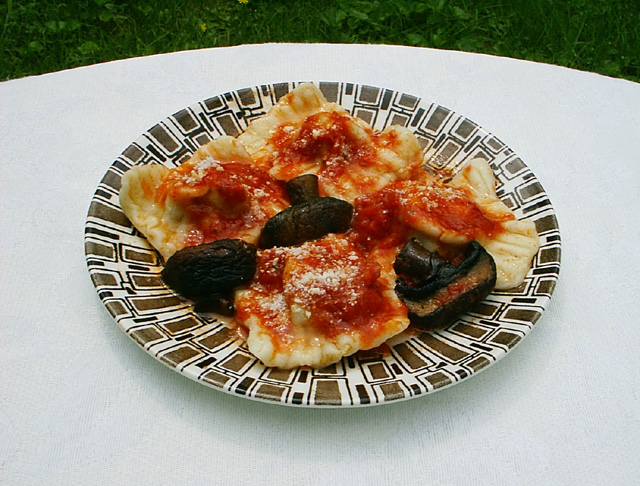 Directions "Drain and chop the greens. Mix well with the curds, egg, a little grated cheese, salt and nutmeg. Make a paste such as that described in the recipe for Pasta Fatta in Casa. Roll out this pasta very thin and mark it off in two or three inch squares. Place a spoonful of the mixture on each square. Fold together diagonally. Moisten the edges with the finger dipped in cold water, to make them stick together, and press them down with the fingers or the times of a fork. Another method is to put the spoonfuls of the mixture in a row two inches from the edge of the paste and two inches apart. Fold over the edge of the paste. Cut off the whole strip thus formed, and cut into squares with the mixture in the middle of each square. Boil these ravioli in salted water, being careful not to break them open. Drain and serve with a tomato sauce containing mushrooms, either fresh ones, or the dried mushrooms soaked and simmered until tender. Arrange the ravioli on a platter, pour the hot sauce over them and finish with a sprinkling of grated cheese."