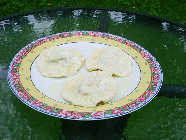Directions "Make a paste with a quarter pound of flour, the yolk of two eggs, a little salt and two ounces of butter. Knead this into a firm smooth paste and wrap it up in a damp cloth for half an hour, then roll it out as thin as possible, moisten it with a paste-brush dipped in water, and cut int into circular pieces about three inches in diameter. On each piece put about a teaspoonful of forcemeat of fowl, game or fish mixed with a little grated Parmesan and the yolks of one or two eggs. Fold the paste over the forcemeat and pinch the edges together, so as to give them the shape of little puffs; let them dry in the larder, then blanch by boiling them in stock for quarter of an hour and drain them in a napkin. butter a fire-proof dish, put in a layer of the ravioli, powder them over with grated Parmesan, then another layer of ravioli and more Parmesan. Then add enough very good gravy to cover them, put the dish in the oven for about twenty-five minutes, and serve in the dish." Notes This recipe was taken from "The Cook's Decameron: a Study in Taste, containing over two hundred recipes for Italian dishes," by Mrs. W.G. Waters. It was published by William Heineman in 1920. Photo: Mary Melfi. |