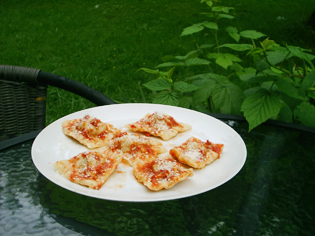 Notes This recipe was taken from "Italian Cooking" by Dorothy Daly. It was published in 1900 by Spring Books in Great Britain. For the complete copyright-free cookbook see www.archive.org. For a variety of recipes from this cookbook see Italy Revisited/"XXX Italian Cookbook by Antonia Isola"........ In the introduction to the ravioli section Daly says:"Having mastered the cooking of pasta of the macaroni and spaghetti variety, let us now proceed to the more involved types known broadly as 'ravioli' and 'gnocchi. Both may be made at home, and after a little practice made well, and although it is possible to purchase both types ready-made and needing only to be heated and added to a sauce, if there is time available to make one's own ravioli or gnocchi, the results are well worth while. Ravioli is the term loosely applied to the several varieties of little envelopes of paste filled with various forms of stuffing, and served either, like 'pasta asciutta', with a tomato or meat sauce, or, like 'pasta in brodo' in a clear consomme rather after the style of the Jewish 'kraplech', or the Chinese *pork pellets'. Once you have become expert in the art of making tagliatelle at home, you may, if you wish, use the same recipe for your ravioli, agnolotti, anolini, tortellini, or cappelletti, to give a few of the various names given to the many types of filled pasta." P.S. What's incredible about this recipe (at least what's incredible to me) is that the filling used for the ravioli is almost identical to the filling my own mother uses to make canneloni. I associated this style of cooking with Molise, the region my mother comes from, but it seems that when it comes to pasta, the recipes from the Northern and Southern regions are more similar than different (except, of course, for the tossing sauces, with the Northern regions favoring cheese-based sauces, and with the Southern regions favoring tomato-based ones). Photo and notes: Mary Melfi. |