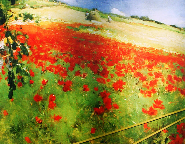 Directions "Boil three-quarters of a pound of fresh spaghetti in plenty of salted water for three-quarters of a hour, with an onion stuck with cloves, and half an ounce of butter. Drain and put them into a saucepan with half a pint of Tomato sauce (or tomato conserve), half a pint of sauce 'Suprema,'[See Sauces] two truffles, seven or eight mushrooms, and a piece of smoked tongue, all cup small. Add a little pepper, grated nutmeg, and a quarter of a pound of grated Parmesan cheese. Cook for ten minutes, tossing well, serve hot with some grated Parmesan cheese separate." Notes This recipe was taken from "Leaves from our Tuscan Kitchen" by Ann Janet Ross. The book was published by JM Dent & Co. in 1900 (London). For the complete cookbook see www.archive.org.... Image -- William Blair Bruce, Landscape with Poppies, 1887. |