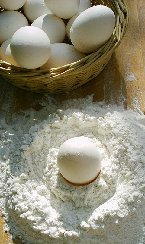Directions "The best and most tender pasta is made simply of eggs and flour and salt. Water may be substituted for part of the eggs, for economy, or when a less rich pasta is needed. Allow about a cup of flour to an egg. Put the flour on a bread board, make a hole in the middle and break in the egg. Use any extra whites that are on hand. Work it with a fork until it is firm enough to work with the hands. Knead it thoroughly, adding more flour if necessary, until you have a paste you can roll out. Roll it as thin as a ten cent piece. If the sheet of pasta is too large to handle with an ordinary rolling pin, a broom handle which has been sawed off, scrubbed and sandpapered, will serve in lieu of the long Italian rolling pin. This pasta may be cut in ribbons to be cooked in soup as tagliatelli, or cut in squares or circles and filled with various mixtures to make cappelletti, ravioli, etc. Any bits that are left or become too dry to work may be made into a ball and kept for some time to grated into soup, in which it makes an excellent thickening." Notes This recipe was taken from "Practical Italian Recipes, sold for the Benefit of Italian War Orphans," by Julia Lovejoy Cuniberti. It was published in Washington, D.C. in 1918. For the entire copyright-free cookbook see www.archive.org.... P.S. I have to admit I agree with Cuniberti -- "The best and most tender pasta is made simply of eggs and flour and salt." This is how my own mother made her pasta noodles for lasagna and cannelloni in Canada for the past 50 years. She never added water to moisten the dough -- always an extra egg. However, when she was growing up in Molise in the 1930s, because eggs were expensive, few home cooks had that that luxury. Photo and notes: Mary Melfi. |