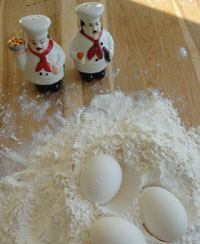 Recipes for homemade egg pasta differ. Some cooks use flour, eggs, salt, oil and water. Others use flour, eggs and water etc. However, my mother only uses flour and eggs. No salt, no water, no oil (Actually many professional Italian chefs also make their egg pastas with just eggs and flour!). Generally, my mother manages to use one egg for every cup of flour, but I have never been able to do this. Sometimes I even use two eggs for every cup of flour. Adding extra eggs to the flour does not deter from the taste of the pasta, in fact, it can enhance it. A softer dough will produce a better tasting pasta dish, though, of course, if it's "too" soft then the mixture will not turn into a dough, but will end up as mush.... Growing up Christmas or Easter would have been unthinkable without home-made lasagna or cannelloni. Growing up I took home-made pasta for granted. Now that my mother is getting on in years, she no longer enjoys doing it (Too much work!). So, if I want it, I have to do it myself. That's why I love my pasta machine. Without it, I could not make home-made pasta. In Italy, prior to World War II, those living in the countryside did not have pasta machines. In fact, my mother says she never saw a pasta machine until she came to Canada. Also, when she was growing up in the 1930s eggs were expensive, so one couldn't simply add more eggs to the pasta dough to make it easier to handle. So, one had to do things right (One couldn't be impatient or lazy or whatever!). Luckily, nowadays one can be a not-so-great cook and still manage to put something on the table.... Photo: Mary Melfi. |