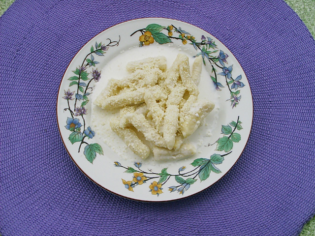 Notes Gnocchi are made throughout Italy. Generally in the South they are tossed with red sauce and in the North, with white sauce. Well, at least, such was the case prior to World War II. Recipes for potato gnocchi don't vary all that much -- the amount of flour, eggs and potatoes might be a little different but not that much. My late aunt's gnocchi were quite wonderful, unfortunately I did not watch her do them, so now I have to study various cookbooks and find a recipe I can actually do. Potato gnocchi are not that easy to make; they can easily break up when they are boiled. Thankfully when they do work, they're much better than the ones that are sold in grocery stores. Photo: Mary Melfi |
