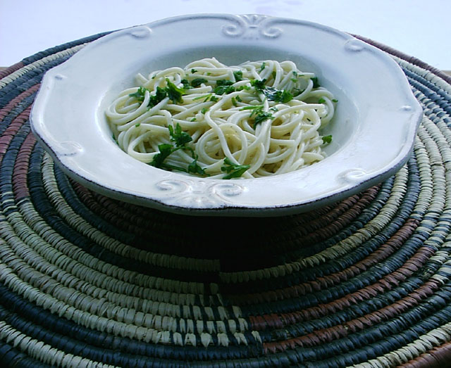 Directions "Heat oil in a heavy pan ; add garlic and allow to brown slightly, add chopped parsley and simmer gently for five minutes. Pour over cooked and drained spaghetti, mix well and serve with grated Parmesan and black pepper."