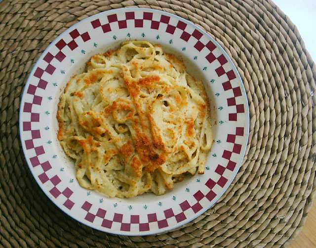 Directions "Take one pound of flour, three eggs, half a tumbler of milk, and a pinch of salt, mix up into a paste and work it well. Lay it aside for half an hour, then roll it out very thin and let it dry before cutting it into long thin strips (tagliatelle). Boil these in salted water over a very slow fire for twenty minutes and then drain well. Meanwhile prepare four ounces of grated Parmesan cheese, five ounces of grated Gruyere, and six ounces of butter; put a layer of tagliatelle into a baking-dish, and cover them with cheese and butter. Repeat the alternate layers of tagliatelle, cheese and butter, until the dish is full. Sprinkle the top with breadcrumbs and bits of butter, bake in the oven for quarter of an hour and serve in the baking dish very hot." Notes This recipe was taken from "Leaves from our Tuscan Kitchen" by Ann Janet Ross. The book was published by JM Dent & Co. in 1900 (London). For the complete cookbook see www.archive.org.... Photo: Mary Melfi. |