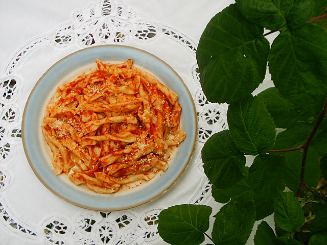 Step 14. Toss the fusilli with home-made tomato sauce and grated Parmesan cheese.