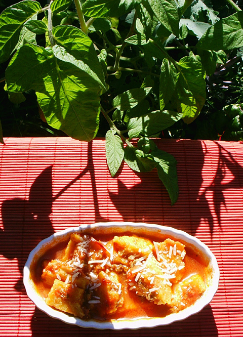 "Put the water on, and when it boils add salt. Then add the Indian meal, little by little, stirring all the time. Allow it to boil over a moderate fire for one-half hour, stirring constantly. When the meal has become quite stiff, take a wooden spoon and dip it into hot water, and with it detach the Indian meal from the side of the saucepan, then hold the saucepan for a moment over the hottest part of the fire, until the Indian meal has become detached from the bottom. Then turn it out onto the bread -board; it should come out whole in a mold. Let it stand a few moments to cool. Then with a wire cut it into slices about the thickness of a finger. Place these slices on a hot platter in a layer; pour over them a good meat gravy and grated cheese; then put on another layer of the polenta, and add more gravy and cheese, and so on, until your polenta is used up."