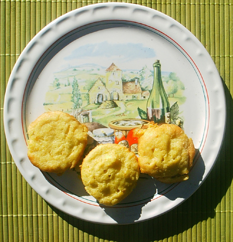 Directions "Scald one pint of Indian corn flour in boiling water. Mix together one dessert-spoonful of butter, two lightly beaten-up eggs, one wine-glassful of cream and a little salt, add this to the corn flour, and drop the paste from a spoon into a well-buttered pan. Bake in a moderate oven."