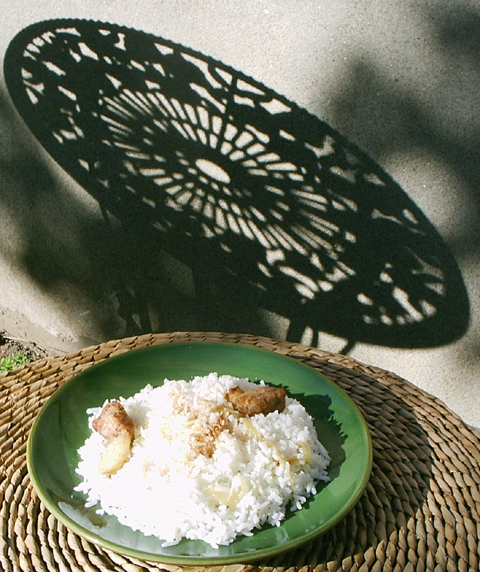 Directions "Cut into small pieces one ounce of raw ham, fat and lean. chop up fine a small piece of onion, and put it with the ham into a frying-pan with one-half a tablespoon of butter. Fry slowly until the ham and onions are golden. Then add one-half cup of uncooked rice; when it has cooked for a few minutes, add twice its height of bouillon (or water), salt and pepper, a dash of nutmeg, and mix well and allow it to boil for twenty minutes over a good fire. Then take off the stove, add two tablespoons of butter and two tablespoons of Parmesan cheese grated; mix well and serve."